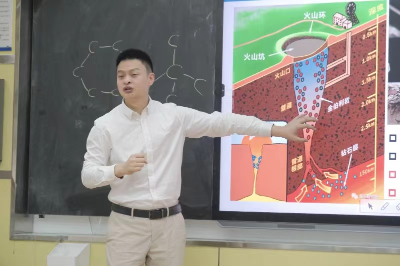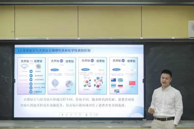 佘老师以钻石珍贵的原因为切入点,以富有趣味又极具深度的讲解方式,让学生了解钻石生产合成,切割打磨,制作成品的全过程,掌握鉴定钻石的基本知识,了解超硬材料作为河南的主导产业现在发展到了什么阶段,又遇到了什么阻碍,未来又会有什么样的发展,层层递进,引人入胜。