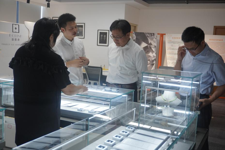 我院常务副院长带领郭程明一行参观研究院的实验室、切磨工作室和珠宝展厅了解我院科技研发与培育钻石产业发展情况。管委会领导对我院所做工作给予肯定。在随后的座谈会上,由常务副院长汇报河南省培育钻石交易中心(以下简称“交易中心”)的工作进展及工作计划。